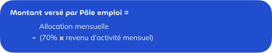Pôle emploi déduit 70 % des revenus d’activités déclarés à l’Urssaf du montant mensuel de l’allocation. C’est le résultat de ce montant qui se cumulera aux revenus d’activité.